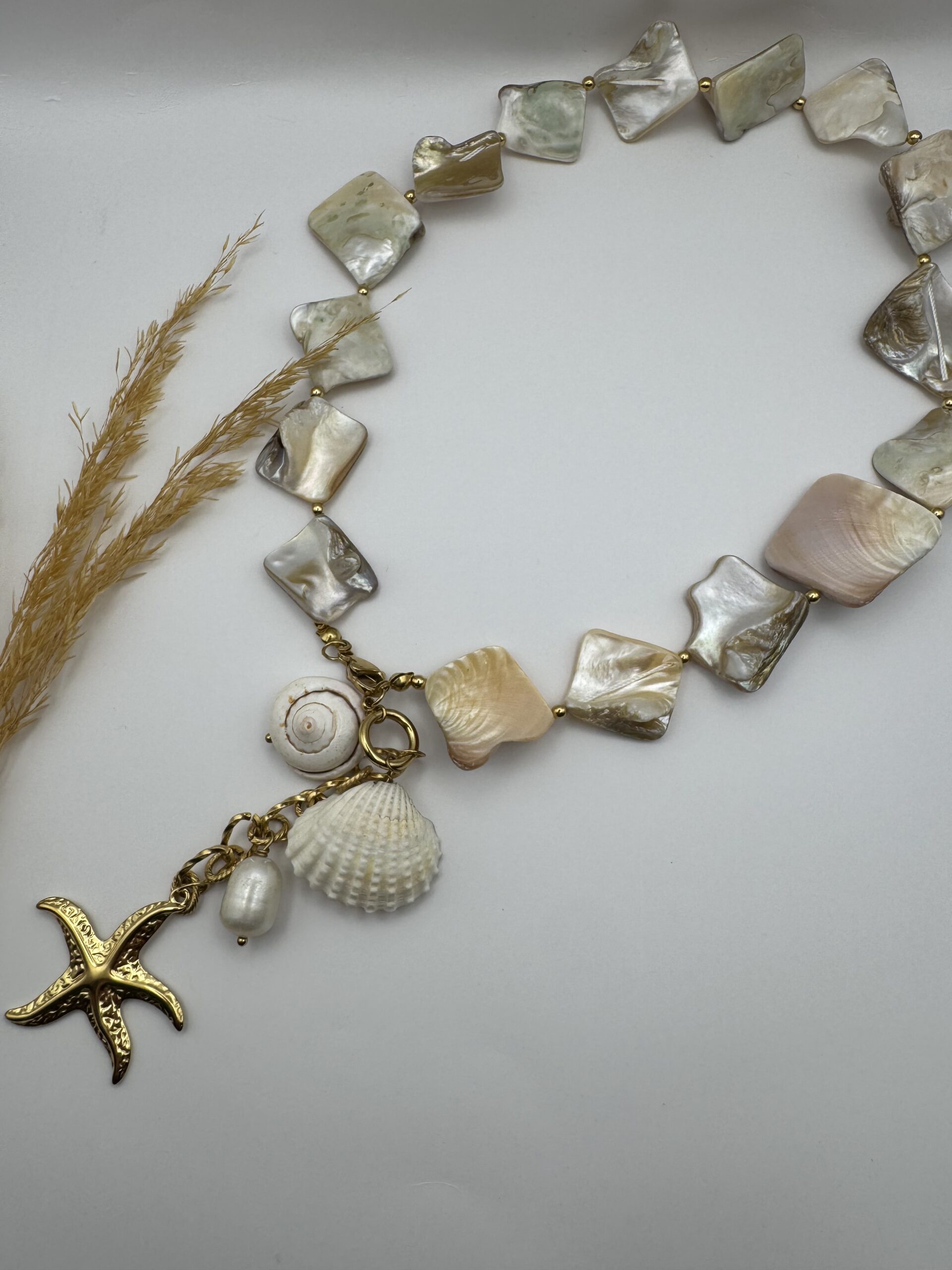 Εντυπωσιακό κολιέ με μεγάλες χάντρες και κρεμαστά στοιχεία κογχυλιού και αστερία. Ένα κόσμημα που θυμίζει καλοκαίρι.